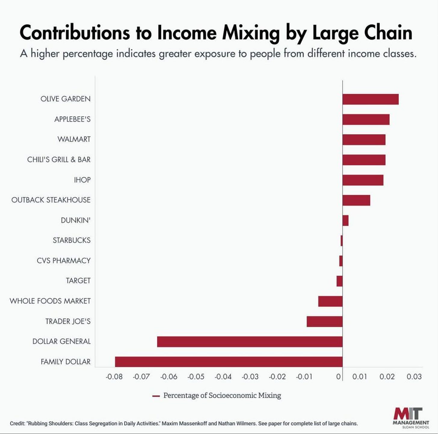Of the 7 brands listed above that are on the positive side of enhancing economic class mixing, 6 of them are restaurant/food brands. The paper specifically calls out chains like Olive Garden and Applebees as effective at facilitating class mixing for a few key reasons: