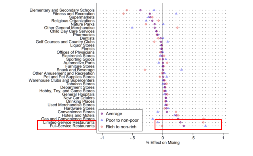 The graphic below from the paper shows that limited and full service restaurants have the highest impact on socioeconomic class mixing of any industry. It’s unfortunate that our educational system is at the opposite end of the spectrum but we’ll leave that for someone else to explore.